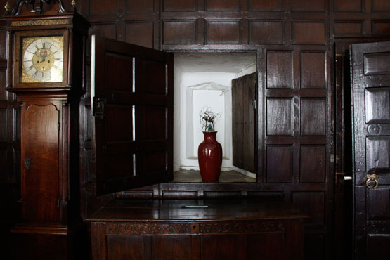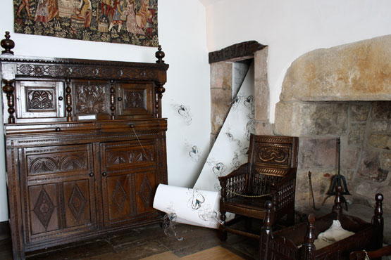 I promised to put photos of my exhibition at Turton Tower, which will end next sunday by the way. This peacock feather necklace is in on one of the bedrooms hanging from a beautiful mirror…I made this necklace by painstakingly breaking the strands from peacock feathers into the shapes i want and then they are individually glued into place. I haven`t used the eye of the peacock feather and i like that i have used the subtle parts of the feather and when it catches the light you can see its colours. The necklace looks fragile, but it is suprisingly strong.