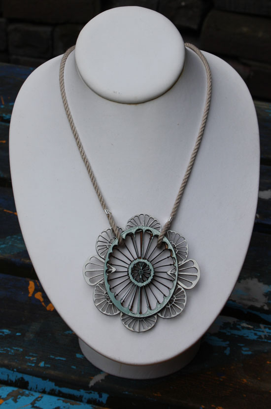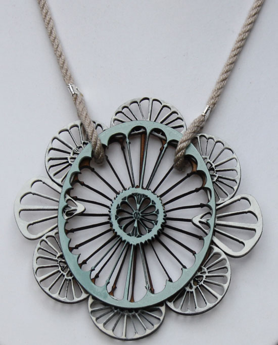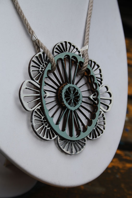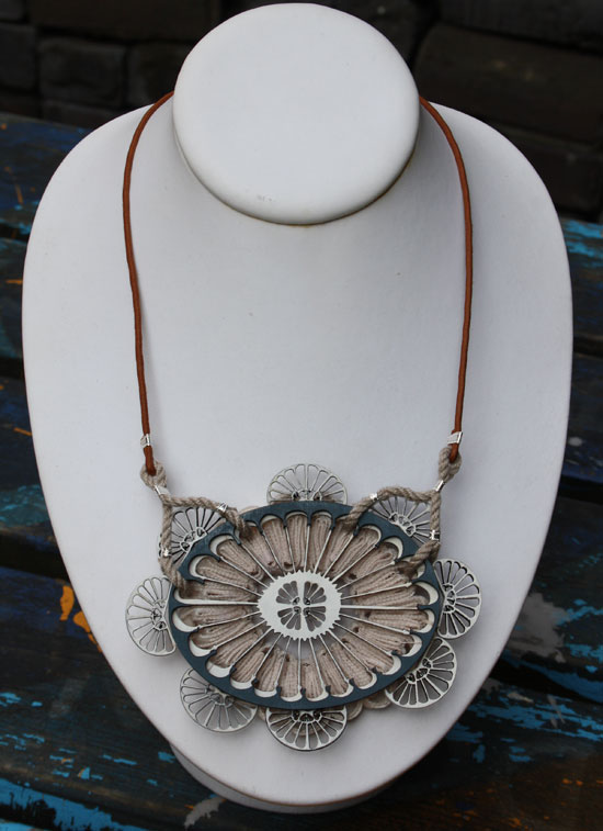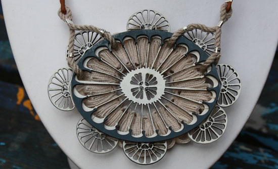 Rosa Necklace….Made from laser cut walnut, quilled velvet ribbon, cord and leather cord.