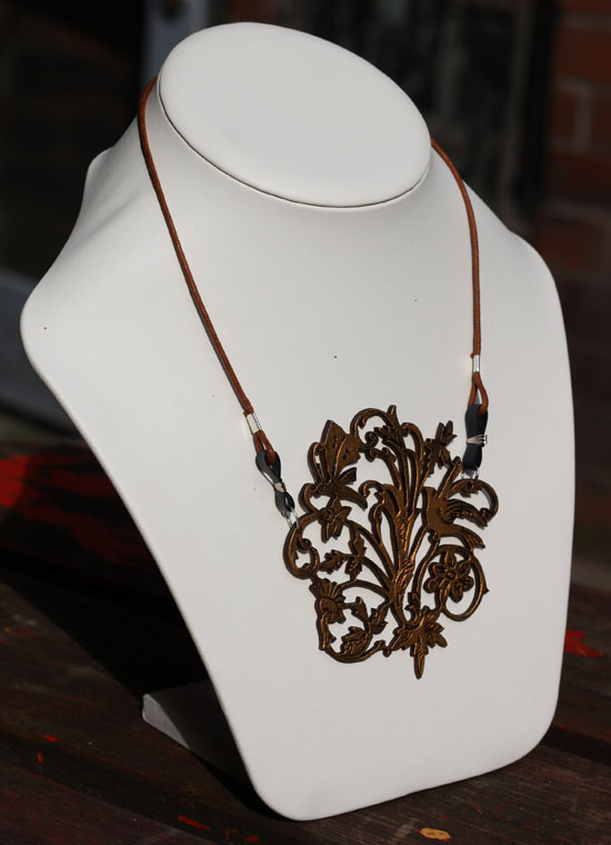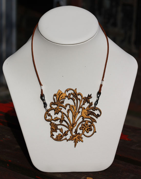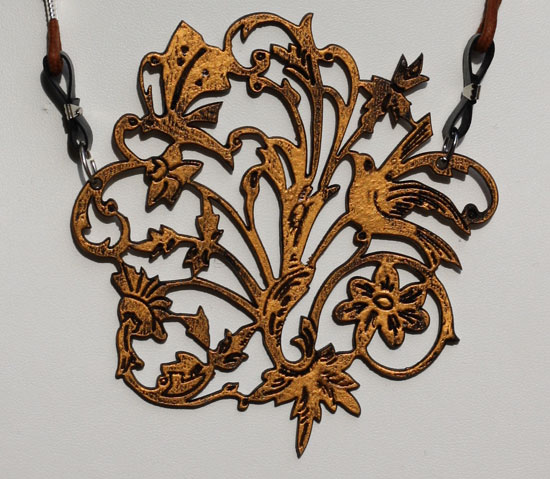 There is already a mirrored acrylic Polly paradise for sale, but this Polly Paradise is made from laser cut walnut hand painted black and gold, with blue leather loops to attach the tan leather strap. It`s so easy to wear and goes with any outfit.