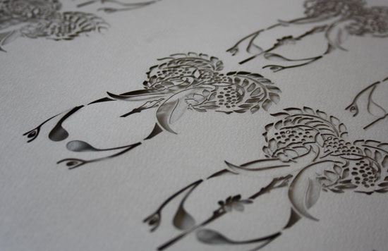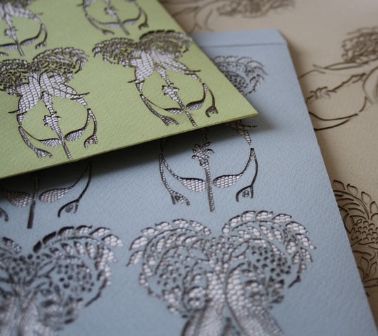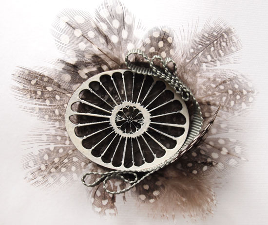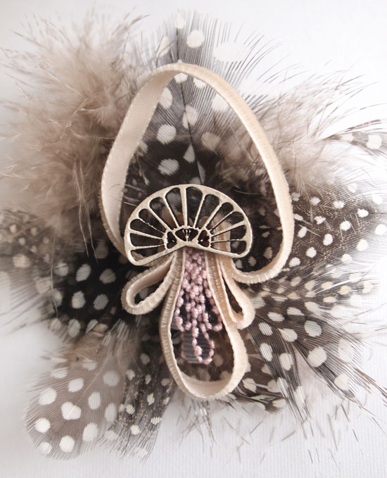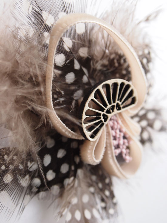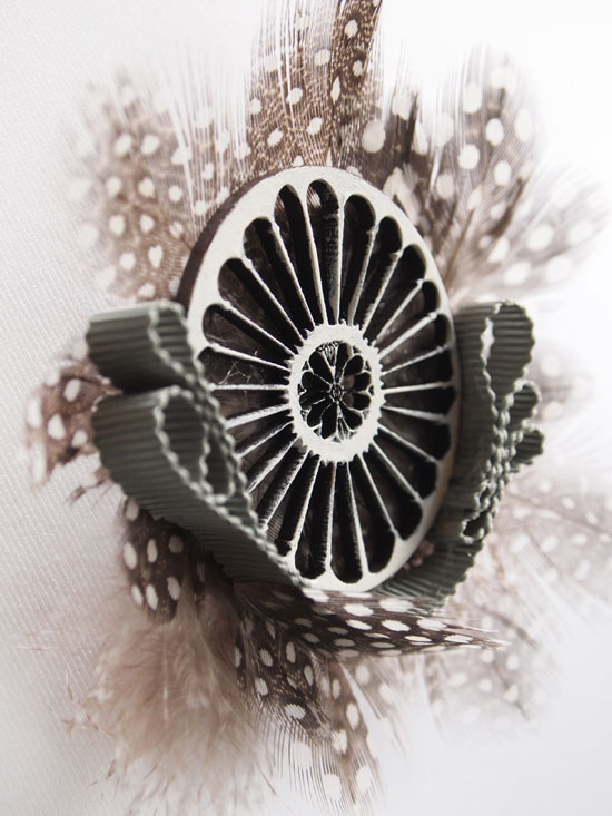 Grace Clementine available to buy here….Grace Clementine is made up of nine laser cut pieces of walnut, layered over quilled nude velvet ribbbon. The layers of walnut are hand painted white and sea blue. Gold clasp is available, please e-mail to order. The motif is 11.5 cm by 9cm and the length including the motif is 28 cm.
