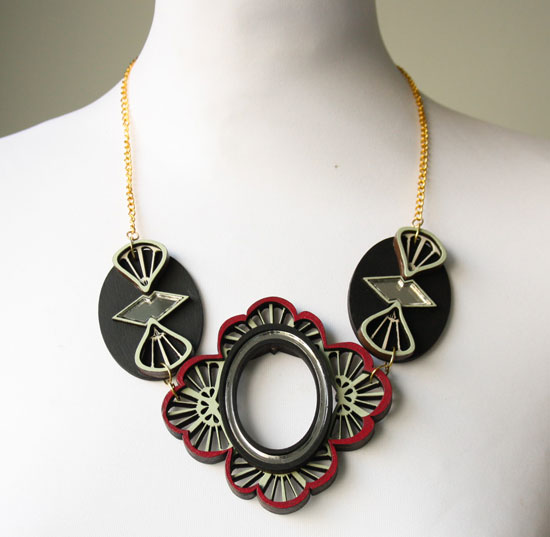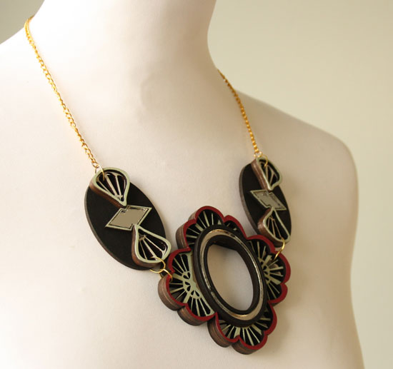 Scarlet is made from layered walnut and mirrored acrylic, painted scarlet, black and sky blue with a gold plated chain and clasp.