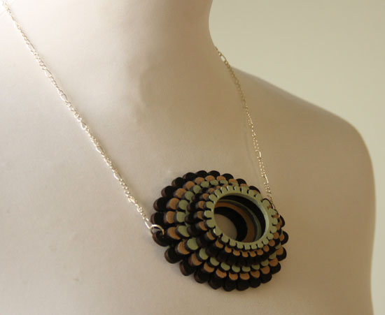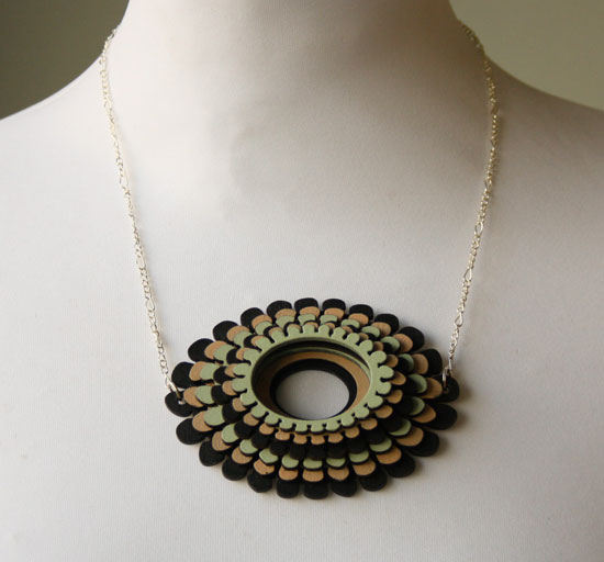 Lucille below is made from layered walnut with hints of mirrored acrylic, painted nude, black and sky blue with a gold plated chain and clasp.